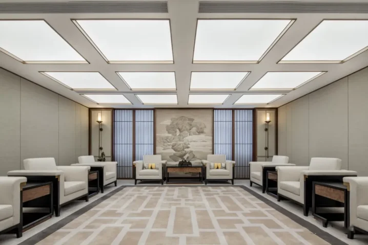 The light of VIP reception room adopts the combination of linear lamp and sky lantern, the whole linear lamp is controlled, and the ceiling lamp adopts single lamp control mode; The meeting room meets the modes of projection, discussion and reception, and the lighting is controlled by the blue view smart control system.