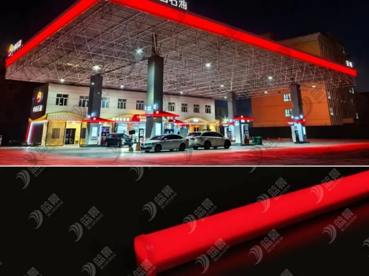 To create the signature “brand red” effect, Blueview’s ultra-slim linear wall washers were installed. Equipped with secondary optics for even light distribution, they enhance the architectural lines of the canopy while meeting nighttime operational needs.