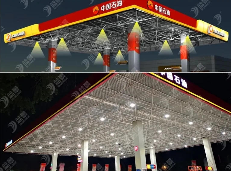 Proper horizontal illumination ensures driving safety, while suitable vertical brightness supports accurate refueling operations. With scientific lighting distribution and anti-glare fixtures, Blueview’s solution enhances nighttime visibility, ensuring safety and operational efficiency under the canopy.