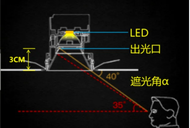 - Avoid glare: Use lighting fixtures with glare control measures, such as reflector cups or deeper central structures, to increase the shielding angle (α) and ensure a certain distance between the LED light outlet and the surface of the fixture (>2.5CM recommended). Use frosted or diffused surfaces to scatter the concentrated light and reduce the perceived surface brightness, creating a softer light and controlling glare.