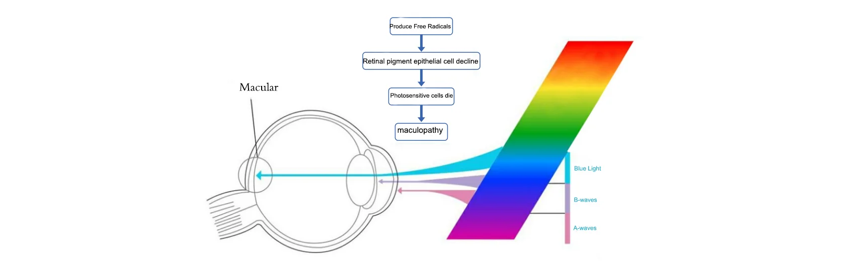 The harm of blue light is mainly reflected in the following aspects. Firstly, it is easy to cause visual fatigue and decrease the vision as time goes by. Secondly, it will cause irreversible damage to the eyes, because harmful blue light with high energy can directly penetrate the lens and reach the retina, not only affects vision, but also causes maculopathy and cataracts, the influence is more pronounced for children who are in the growing and developing period.