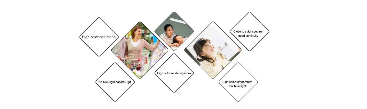 Based on the prevention of blue light hazard, Blueview developed a corresponding full light source product.Its characteristics are the closest to sunlight, good spectral continuity and strong color reduction ability. The color rendering index is close to 100(Ra>97, CRI>95, Rf>95, Rg>98) .