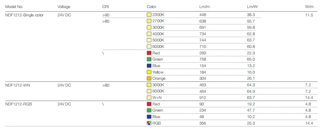- Color options: Single color, WN and RGB.