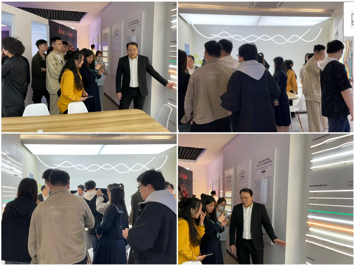 Afterwards, Mr. Liu led everyone to visit the Blueview brand exhibition hall. Through the neon display area, soft strip display area, light box display area, LCD display area, overall store signs & lighting solutions, etc., we can help you understand the output strength of our customized LED light source in an all-round way.