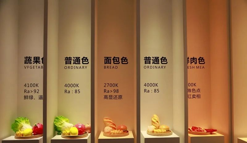 The commercial lighting area gathers specific lighting scenes such as the fresh vegetable and fruit area, building materials area, and clothing area. For different application scenarios, different overall lighting solutions are adopted. For example, the light environment in the store shelf area has a good color reproduction, making drinks look full of color and more attractive and delicious.