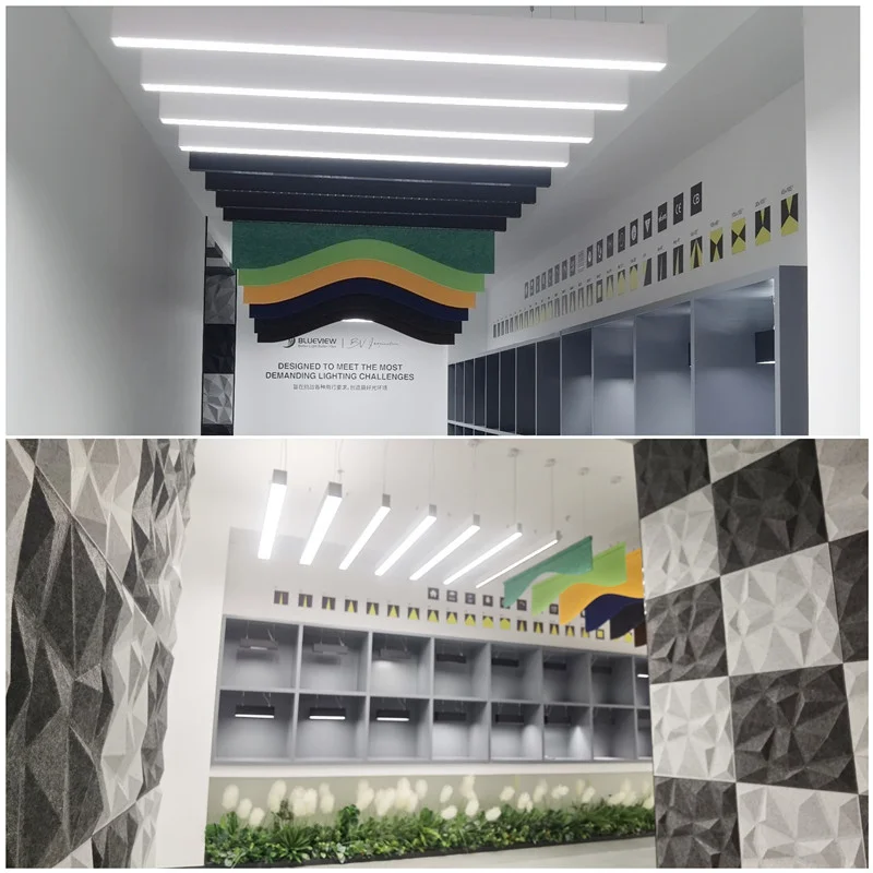 The Blueview acoustic series is also on display. It can be used for both acoustic treatment and decoration. The products adopt high-density boards, leaving more gaps. By consuming sound energy and reducing sound wave reflection, it can reduce indoor noise. The sound-absorbing chandelier is an environmentally friendly product. It is flat and meticulous, strong and compressive. It is mainly suitable for high-end hotels, theaters, museums, office spaces, gymnasiums, schools and other places that require high silence.